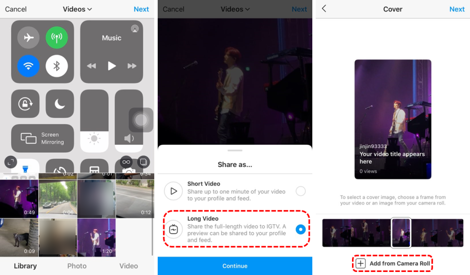 2. 60초 이상의 동영상을 공유하려면 긴 동영상을 선택. 60초 미만 동영상은 짧은 동영상을 선택