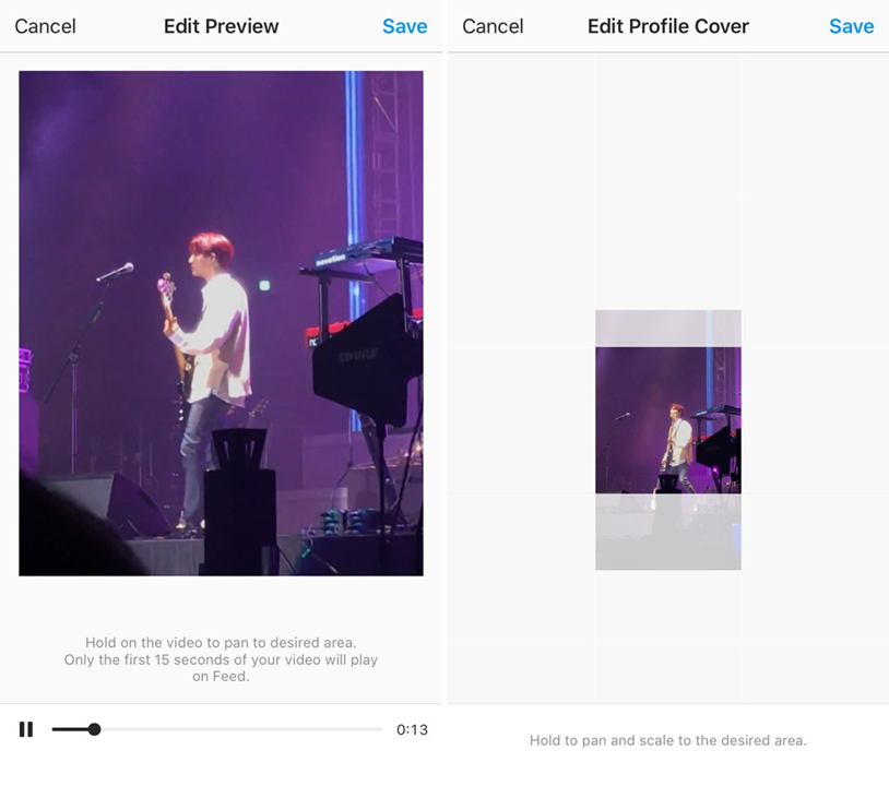 - 미리보기를 게시할 경우 프로필 커버 수정을 눌러 IGTV 커버 사진이 프로필 그리도에 표시되는 방식을 조정할 수 있다.