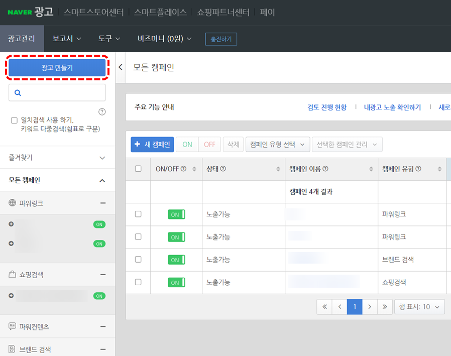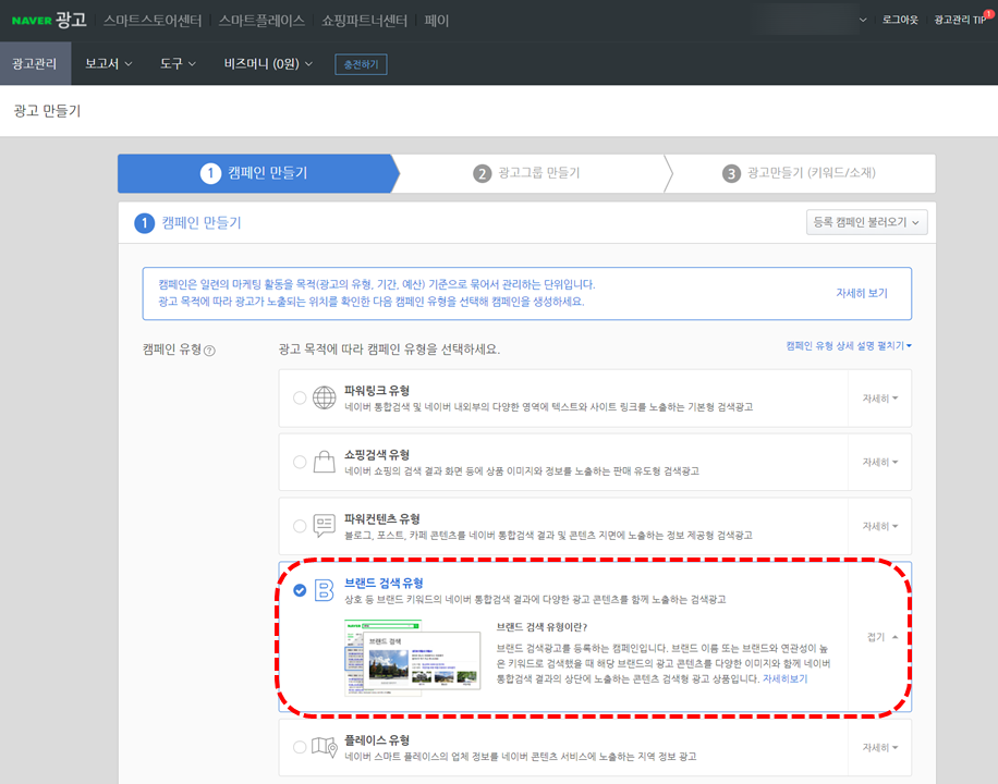 네이버 광고시스템 메인 페이지 좌측 상단에 있는 '광고 만들기'를 클릭하여 캠페인을 생성한다. 캠페인 유형은 '브랜드 검색유형'을 선택!