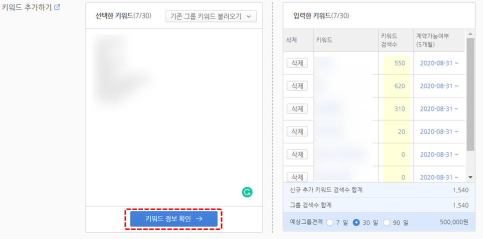 신규 키워드를 입력하고 '키워드 정보 확인'을 클릭하면, 키워드 별 검색수와 키워드 그룹 검색수 합계를 확인할 수 있다. 또한, 하단의 예산그룹견적 메뉴에서 7일/30일/90일 단위로 예상 광고비 견적을 확인할 수 있다.