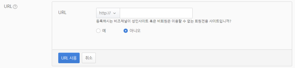 - URL: 사이트(웹사이트, 쇼핑몰)를 대표하는 최상위 도메인을 표시URL로 등록한다. '도구>비즈채널 관리'에서 등록한 기존 웹사이트를 선택하거나 '새로 만들기'를 클릭해 다른 웹사이트를 선택할 수 있다.