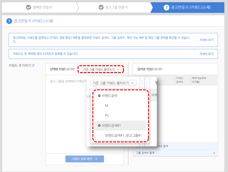 광고그룹을 선택하여 이미 등록된 키워드를 불러오거나 직접 입력해 등록할 수 있다.