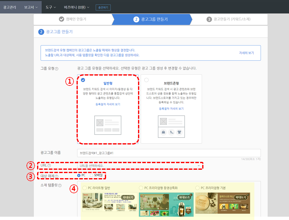 - 그룹 유형: 일반형과 브랜드존형이 있으며, 선택한 광고 그룹 유형은 광고 그룹 생성 후 변경할 수 없다. (보통 일반형을 선택)