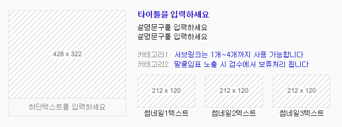 - 이미지 : 가로 212px, 세로 120px 이상 (비율유지), 확장자 jpg, jpeg, png, 용량 10MB 이하