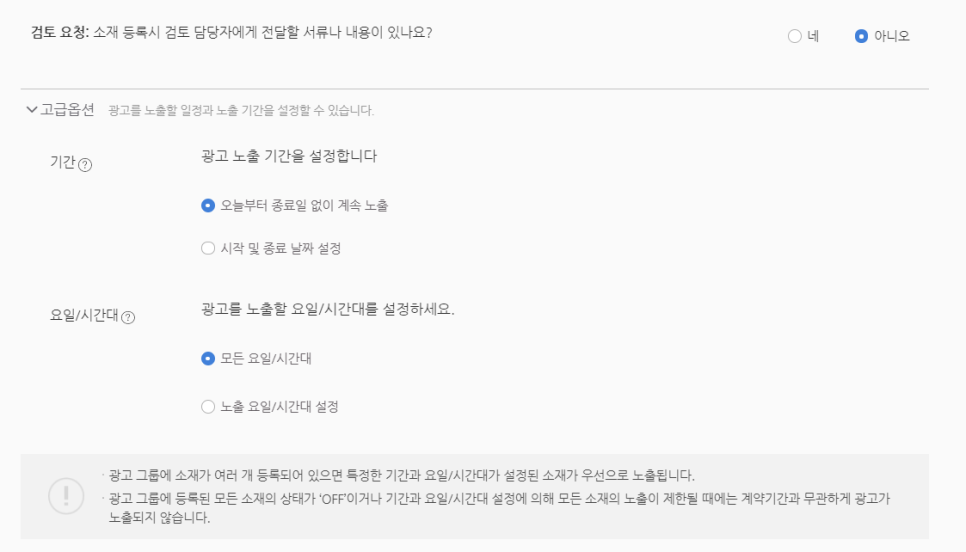 하단의 고급 옵션을 클릭하여 광고 노출 요일/시간대를 설정할 수도 있다.