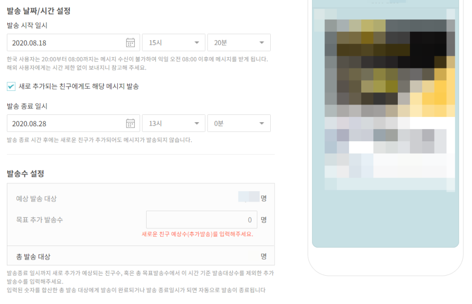 이때, 새로 추가되는 친구에게도 해당 메시지 발송을 선택하게 되면 발송 시점 이후로 추가되는 유저에게도 동일한 메시지가 발송되게 된다 *비용 후불 처리