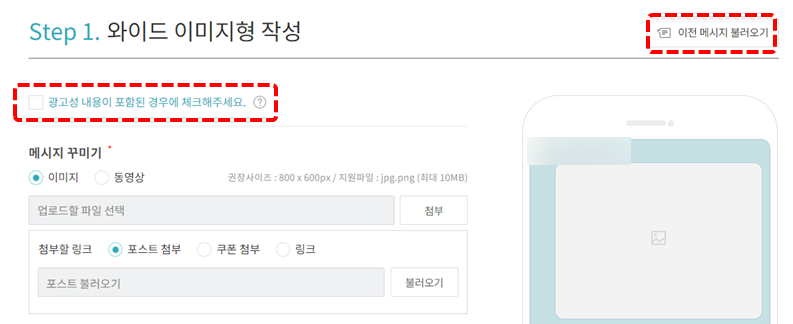 이제 카드를 제작하면 된다. 아래는 가장 많이 사용하는 와이드 이미지형 메시지 제작 예시이다.