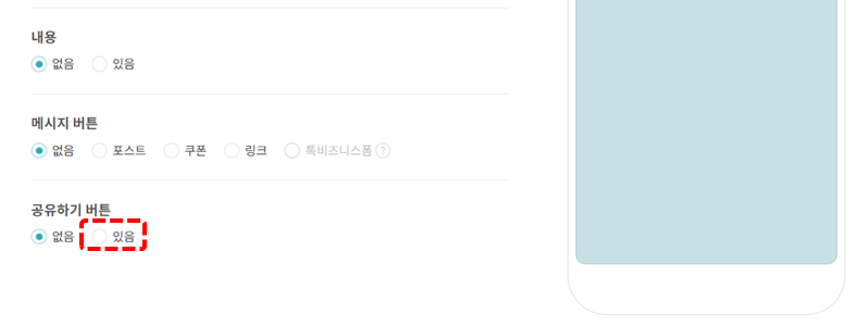 - 텍스트 2줄, 링크버튼 1개 삽입 가능(공유하기 제외)