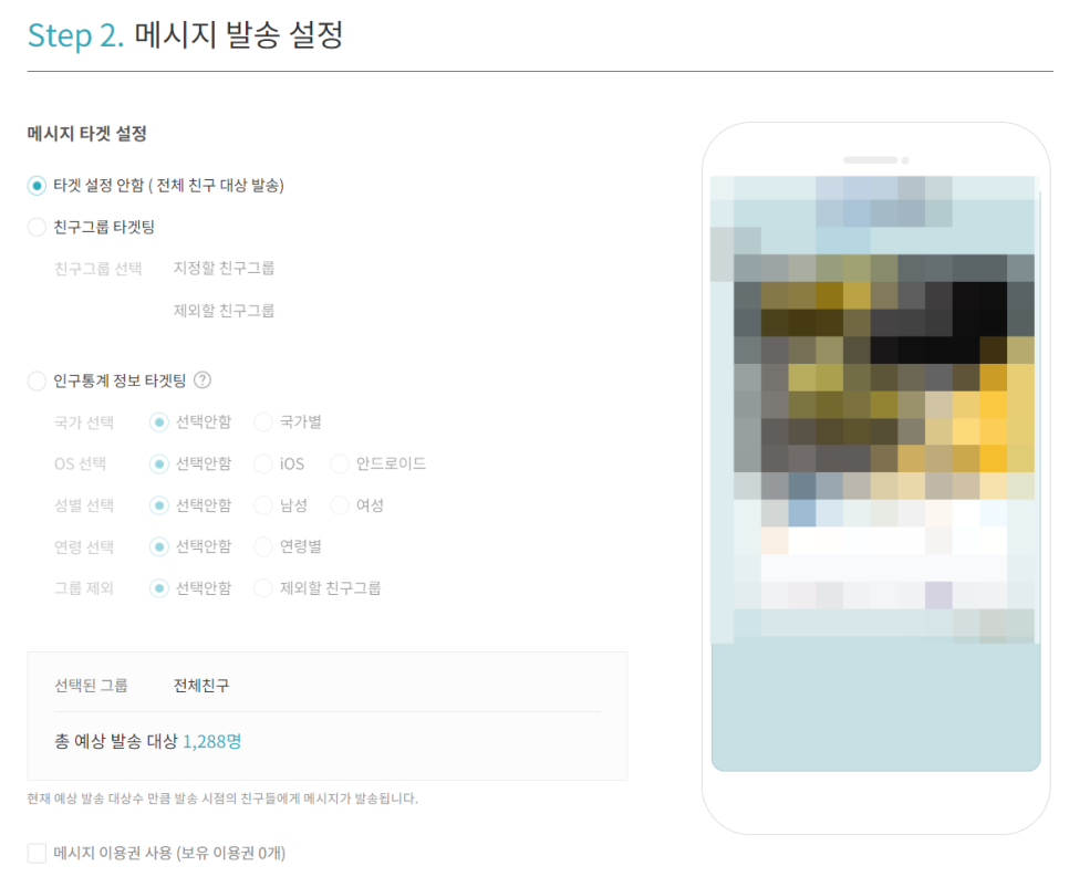 여기에서 메시지 타겟을 설정할 수 있는데, 카카오톡 메시지 특성 상 플러스 친구에게만 전달되기 때문에 굳이 추가 타겟팅을 할 필요는 없다.