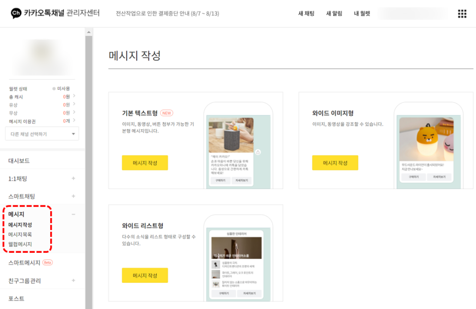 카카오톡채널 관리자센터에서 메시지 신규 작성, 기존 발송한 메시지 목록을 관리할 수 있다. (가입 시 친구에게 가장 먼저 전달되는 '웰컴메세지'도 설정 가능)