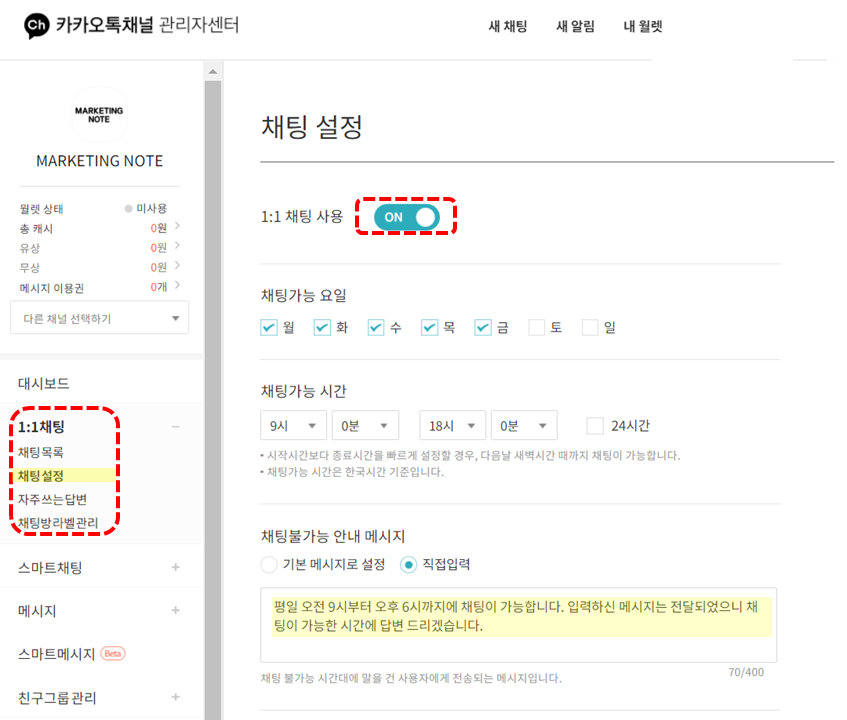 - 채팅불가능 안내 메시지: 기본으로 사용해도 무방하고, 직접 입력해도 좋다.