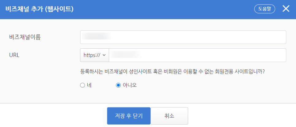 - 비즈채널이름: 팝업창에서 웹사이트 이름을 입력