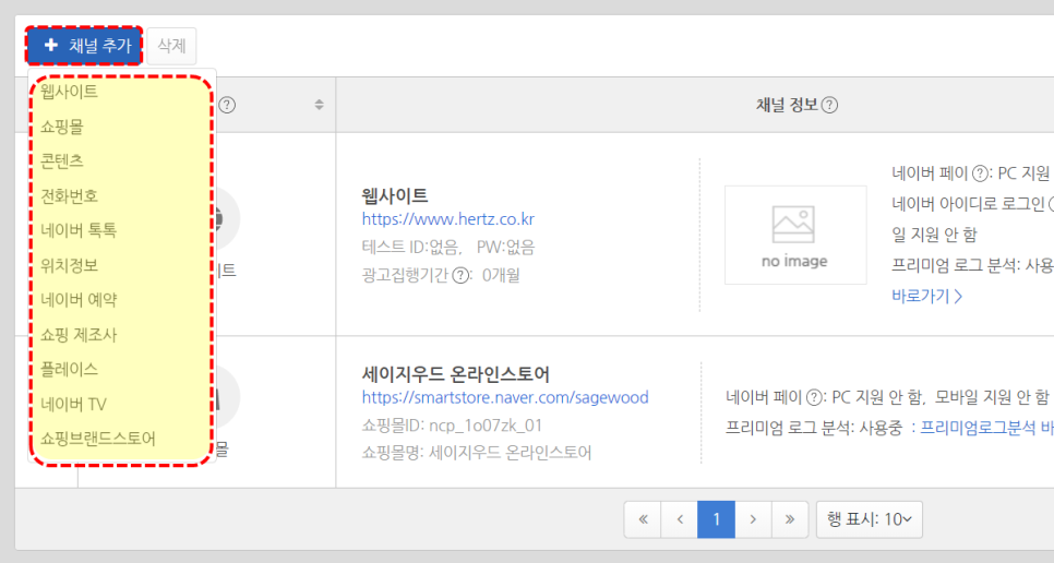 좌측의 [+채널 추가]를 선택, 드롭다운 목록상자를 클릭한다.