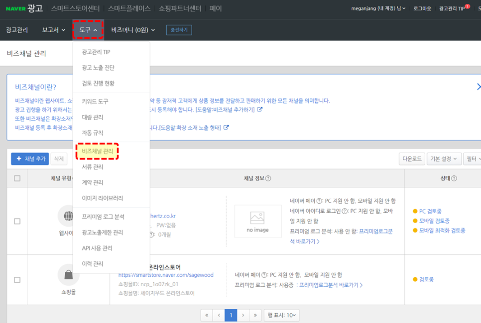 비즈채널 추가는 광고시스템 상단의 [도구>비즈채널 관리] 메뉴에서 진행할 수 있다.