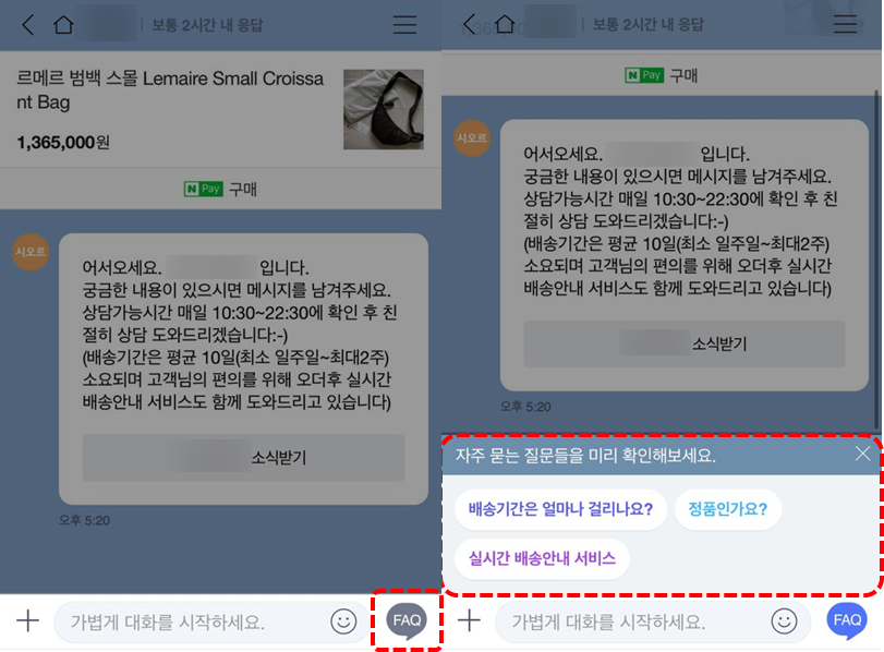 실시간 채팅의 부담을 줄여주는 FAQ 설정/쇼핑봇 기능도 있다.