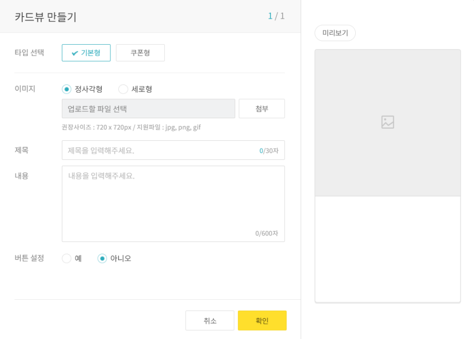 - 이미지와 글로 구성되는 기본형과 쿠폰 페이지를 삽입하는 쿠폰형으로 구성