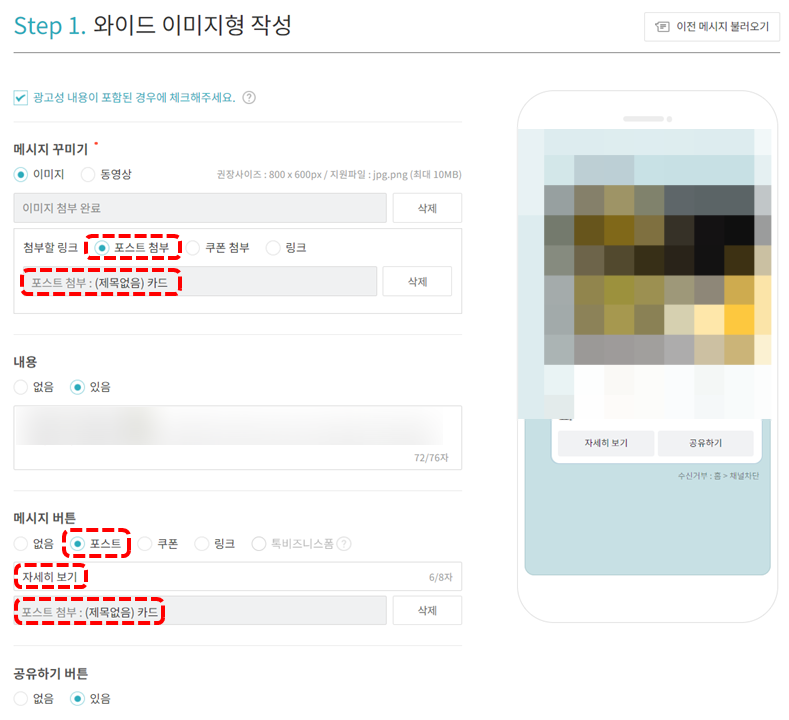 - 메시지 버튼 삽입: 버튼명/포스트 첨부