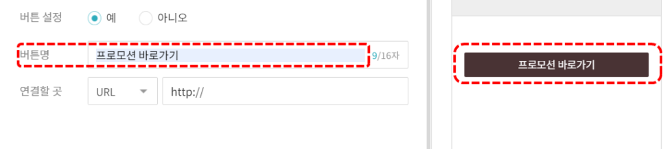 정기 프로모션의 경우, '프로모션 바로가기', '20% 추가할인 혜택 보기' 등 관련 내용으로 버튼명을 입력하고 *연결 URL을 삽입하면 된다.