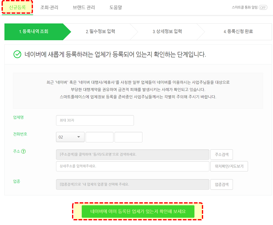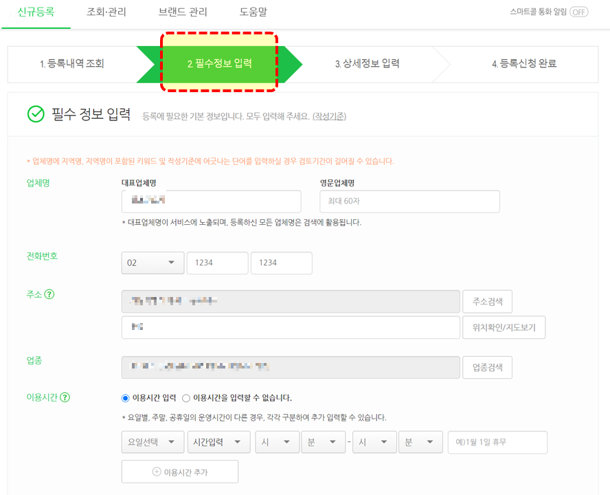 업체명 입력 시, 사업자등록증에 나와있는 업체명과 정확히 일치해야한다. 전화번호 표시는 모바일에서만 활성화된다. (PC에서는 제공하지 않음)