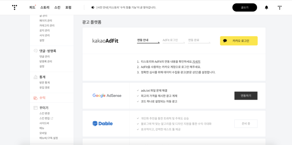 블로그 관리 > [수익] 탭 > KakaoAdFit