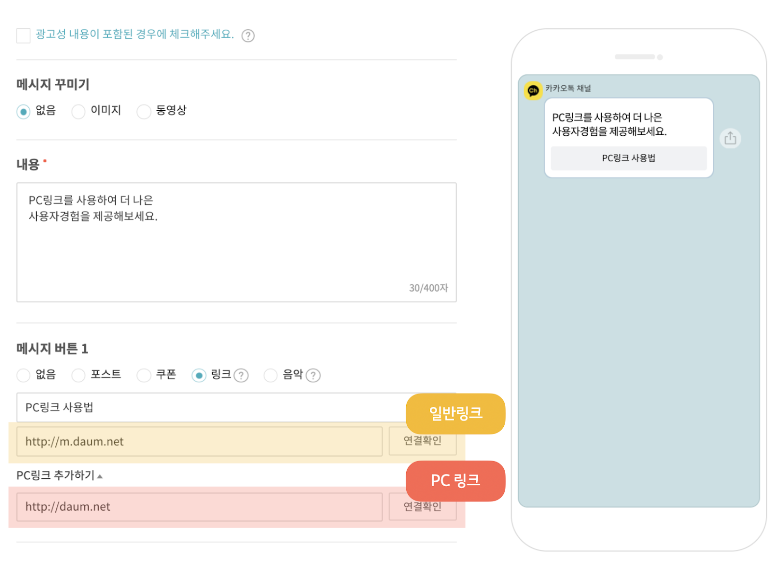 메시지 발송 - 기본형 / 와이드 이미지형 / 와이드 리스트형 메시지 작성시 PC링크를 추가로 첨부할 수 있다.