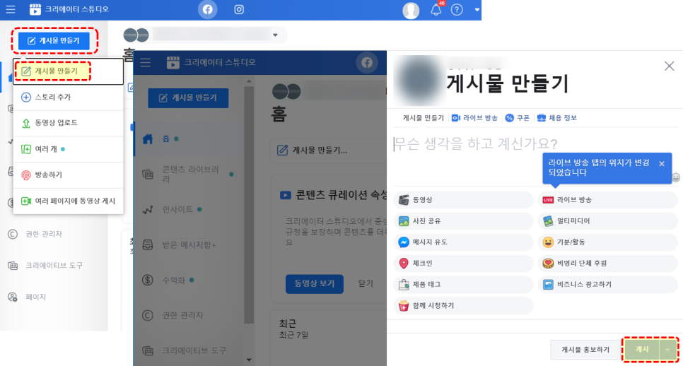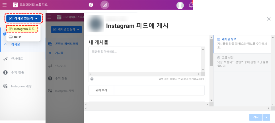 - 좌측 상단 메뉴의 [게시물 만들기] 클릭