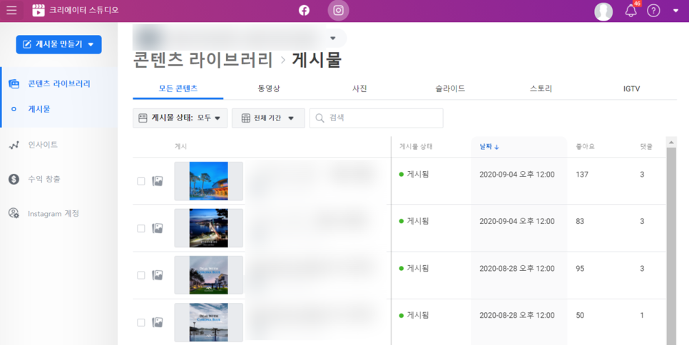 인스타그램 비즈니스 계정으로 연결된 페이스북 아이디로 로그인하면, 페이스북 섹션이 나온다. 이곳에서 페이스북 게시물을 예약, 발행, 관리할 수 있다.