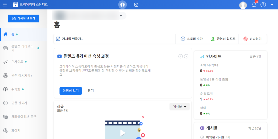 크리에이터 스튜디오는 한곳에서 모든 페이스북 페이지와 인스타그램 계정에 걸쳐 콘텐츠를 효과적으로 게시하고, 관리하고, 수익화하고, 측정하기 위한 다양한 도구를 갖춘 페이지이다.