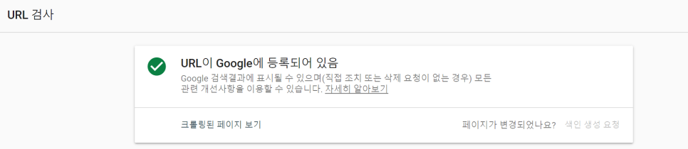 만약 내 글이 구글에 등록되어 있지 않다면 [색인 생성 요청]을 누르셔서 등록할 수 있다. 또한 페이지가 변경되었을 경우에도 색인 생성 요청을 눌러 반영하면 된다.