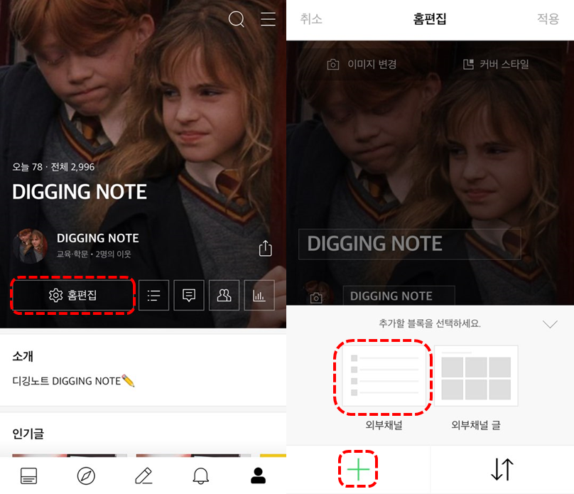 네이버 블로그 홈에도 포스트, 스토어팜은 물론 페이스북, 인스타그램, 유튜브 등 외부 홈페이지 URL을 노출설정할 수있다. 네이버 블로그 모바일 앱에서 외부채널 블록을 추가하면 된다.