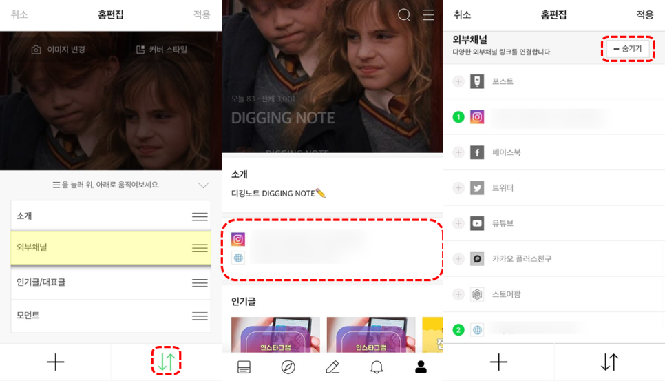네이버 블로그에서는 외부채널외에도 소개글, 수상내역, 인기글 등의 꾸미기 요소를 제공한다. 만약 이들의 배치순서를 바꾸고 싶다면, 이 역시도 [홈편집] 섹션에서 간단하게 변경할 수 있다.
