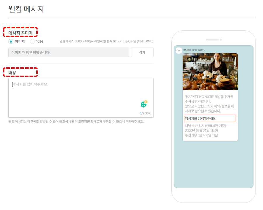 이미지 설정 여부와 웰컴 메시지 문구를 작성하면 된다. 채널 친구를 맺은 고객에게 건네는 첫 인사말을 작성해보자.