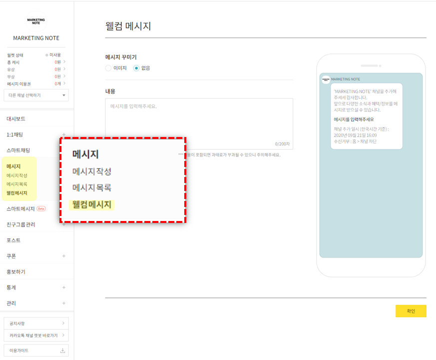카카오톡 채널 관리자 센터(로그인) > 왼쪽 메뉴 바 [메시지] > [웰컴 메시지]