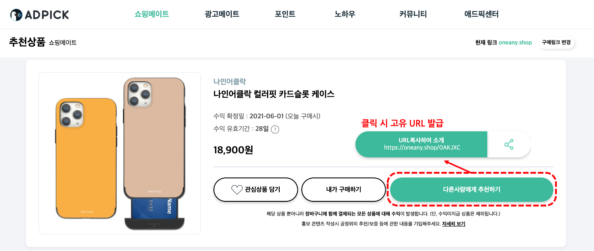 소개하고 싶은 캠페인 또는 상품을 골랐다면 [PICK] 또는 [다른 사람에게 추천하기] 버튼을 눌러 나의 수익 링크를 만들 수 있다.