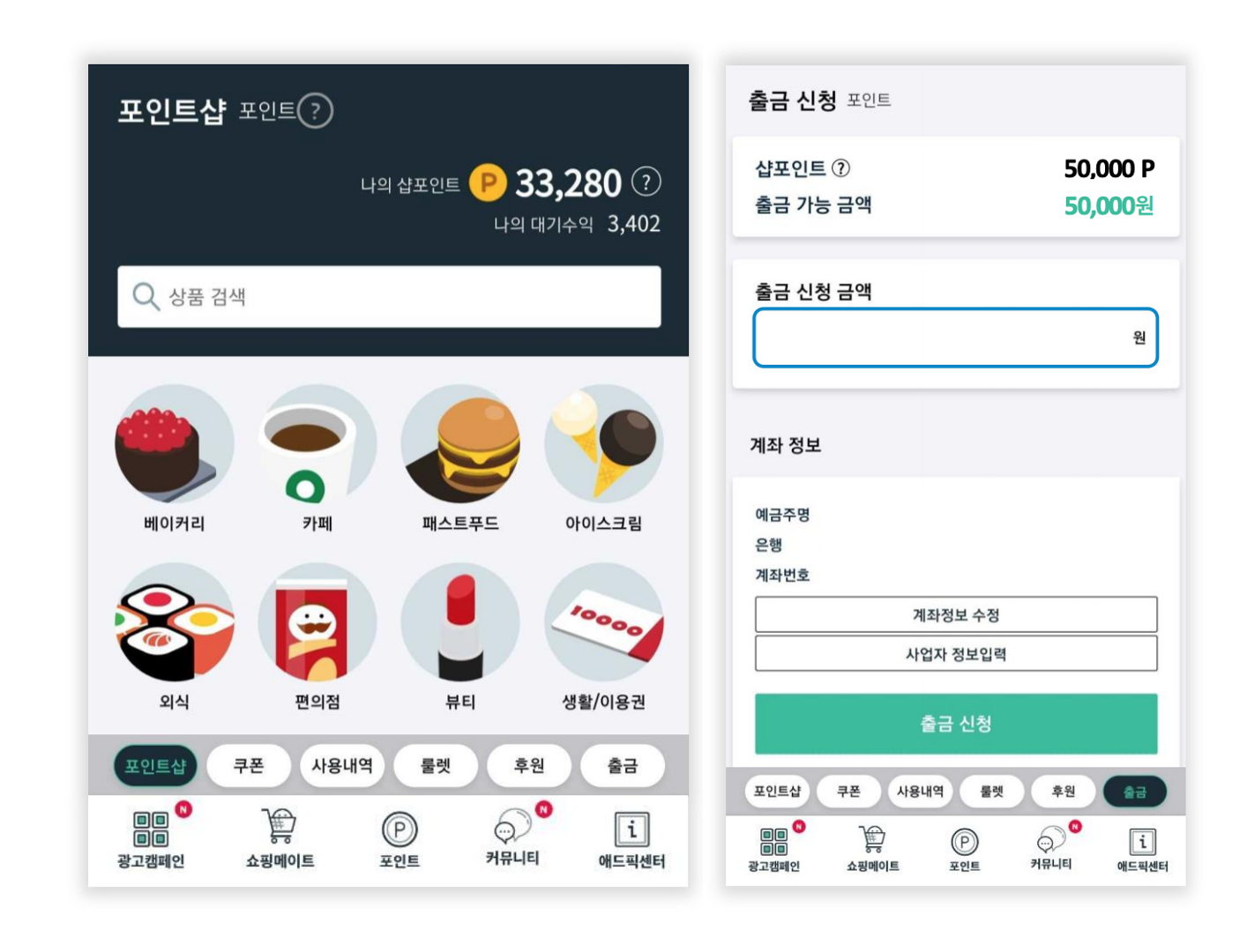 - 샵포인트: 이렇게 모은 포인트는 일정 시간이 지난 후, 실제로 사용할 수 있는 샵포인트로 전환된다. 샵포인트로 포인트샵에서 상품을 구매하거나 출금 신청을 할 수 있다.