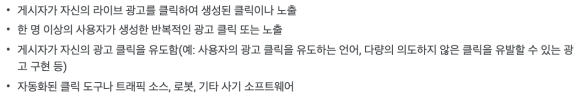 위의 예시처럼 게시자가 지인에게 광고 클릭을 권유해서 클릭이 발생하였다거나, 게시자 본인의 광고가 있는 페이지를 계속해서 클릭하고 조회하는 등 인위적으로 활동이 발생했다고 판단되는 경우 무효 트래픽으로 처리되게 된다.