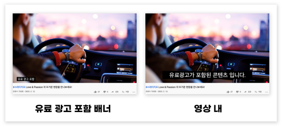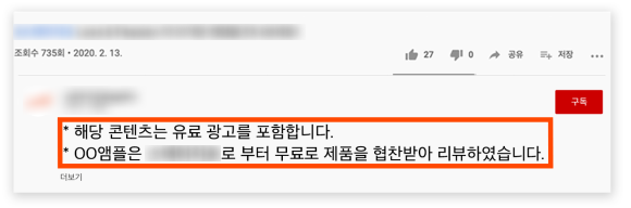 - 시작의 경우, 유튜브 내 기능인 '유료광고포함' 배너를 이용하거나 해당 사실을 영상에 포함하여 경제적 이해관계 사실을 노출한다.