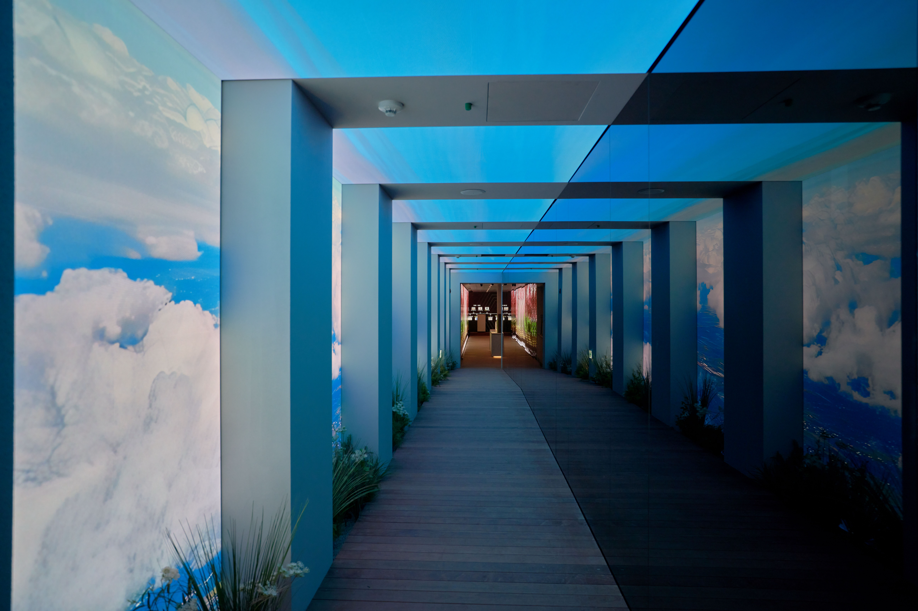 복도를 따라 위아래로 연결된 LED와, 흑경으로 비추는
