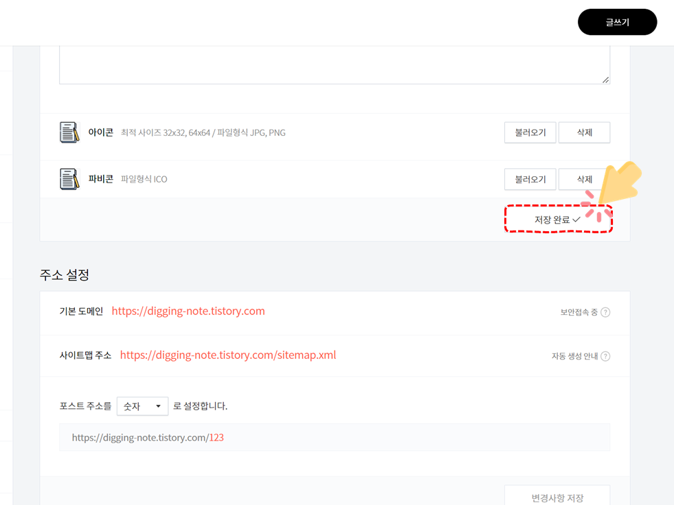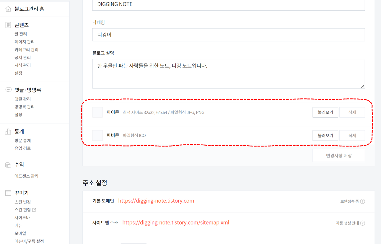 우측 메뉴의 아이콘과 파비콘 항목에서 '불러오기'를 눌러 원하는 사진이나 아이콘을 불러와 적용하면 끝!