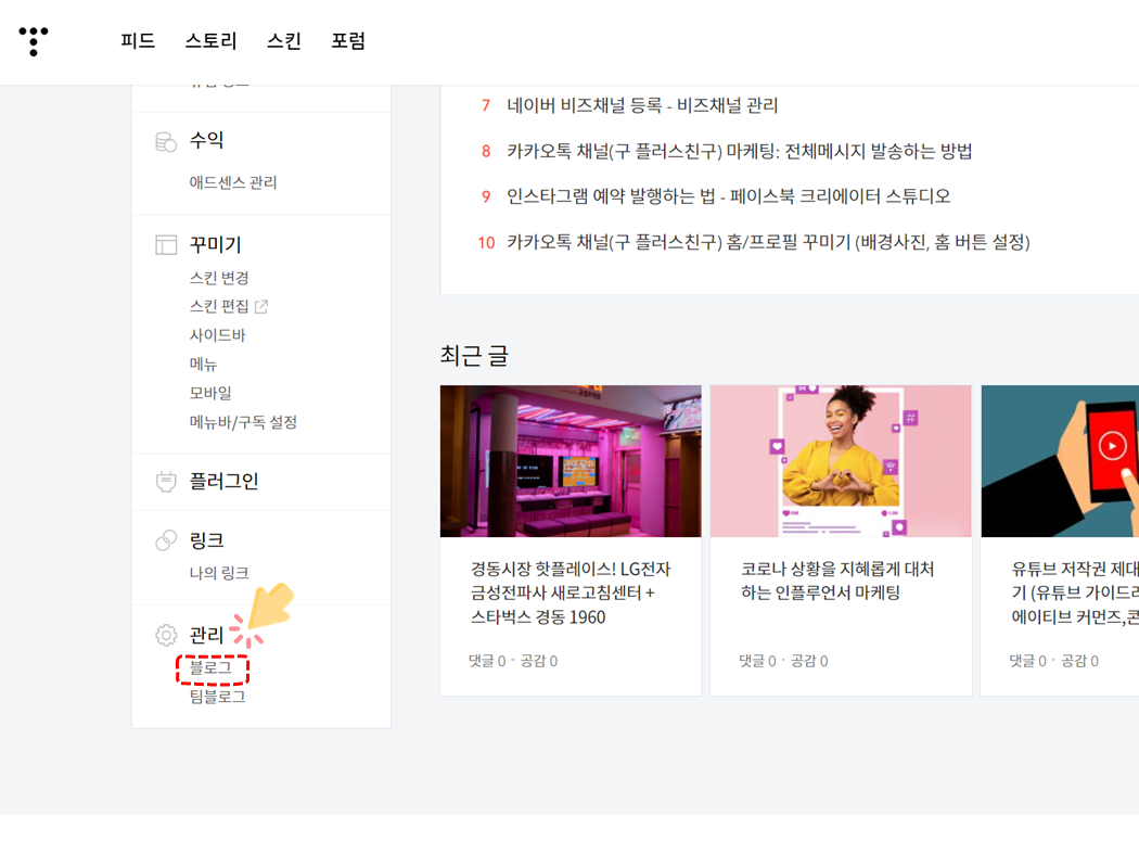 티스토리 블로그의 관리로 들어가 맨 밑의 '블로그' 메뉴로 들어간다.