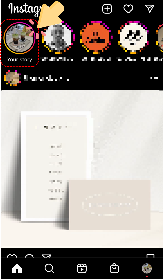 인스타그램 앱 실행 후, 메인화면에서 스토리 추가 버튼을 길게 탭한다.