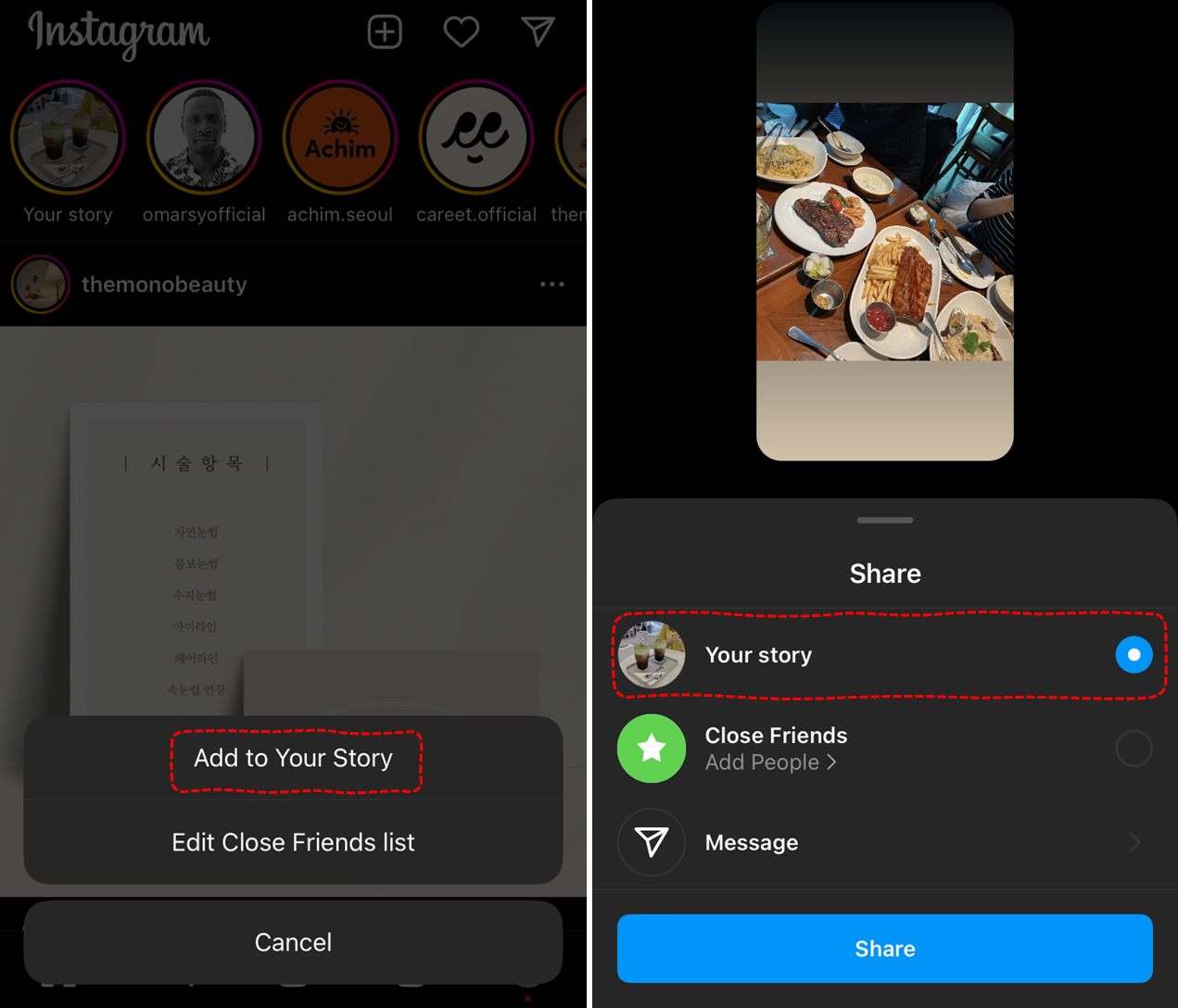 스토리에 추가 옵션이 나오고, 내 스토리에 추가 (Add to Your Story) 버튼을 클릭한다.