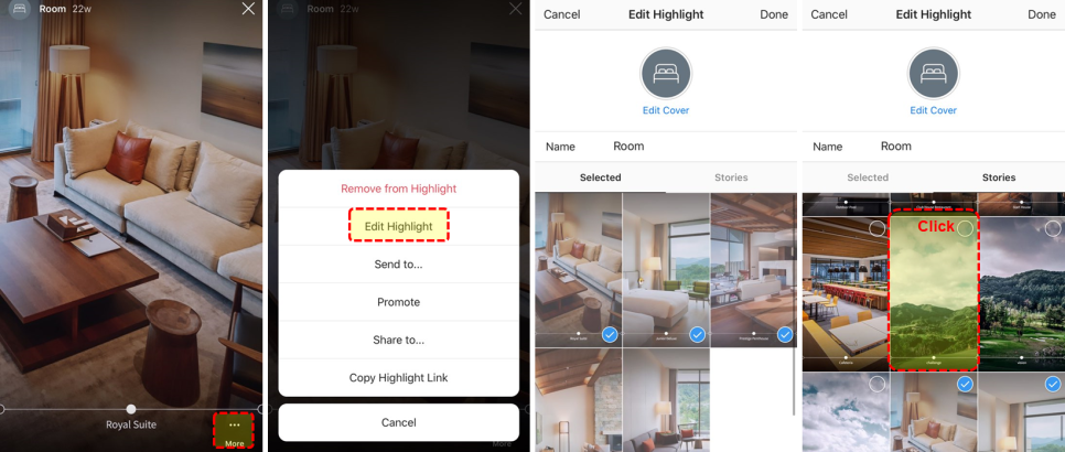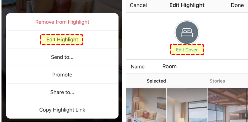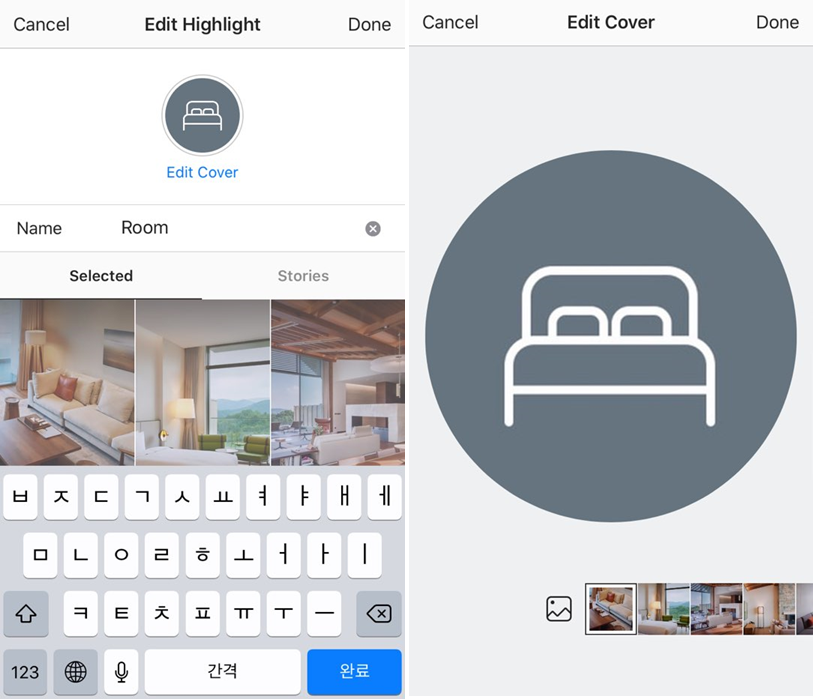 - 하이라이트 이미지와 타이틀은 해당 인스타스토리 콘텐츠의 [Edit Highlight > Edit Cover]메뉴에서 변경할 수 있다.