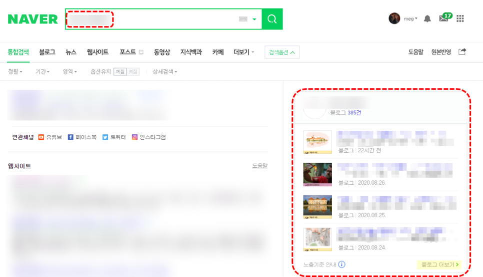 - 블로그, 포스트, 네이버TV, 지식파트너 등